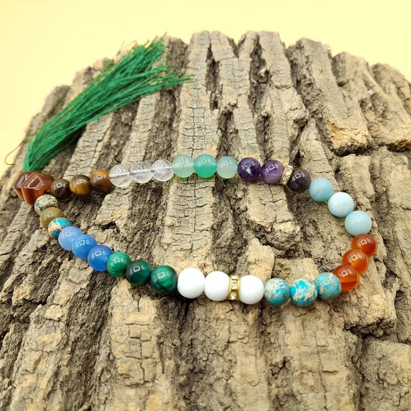 تسبیح عقیق سبز مدل هفت چاکرا علاوه بر مهره های عقیق سبز، سنگ های متعادل کننده چاکراها را هم در