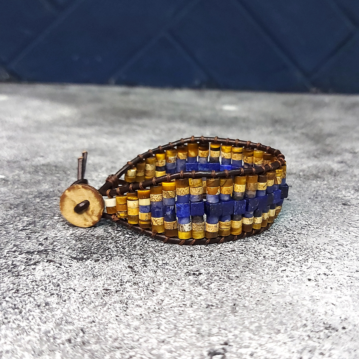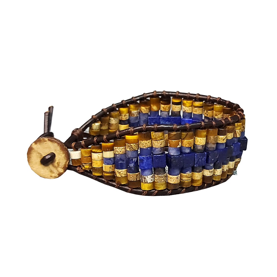 دستبند سنگی لاجورد، چشم ببر و تبتی کد 94 یکی از دستبند های شیک و زیبا است که از سه سنگ جذاب لاجورد، چشم ببر و تبتی تشکیل شده است. طرح این دستبند شلوغ است اما مرتب با چینش هنرمندانه و ظریف. قفل این دستبند به صورتی است که قابلیت تنظیم دارد و می تواند متناسب با سایر دست شما کوچک یا بزرگ شود. سنگ های ردیف میانی این دستبند که لاجورد هستند به صورت مکعب های کوچک مربع تراش داده شده اند. از طرفی سنگ های چشم ببر و تبتی به صورت استوانه ای تراش داده شده اند و در اطراف مهره های لاجورد به صورت ردیفی قرار گرفته اند. این دستبند سنگی یک انتخاب مناسب برای استایل هایی با لباس های سنتی است. البته با توجه به طراحی که این دستبند دارد شما می توانید آن را با دیگر استایل های خود ست کنید. این دستبند با توجه به ترکیب رنگی که دارد می تواند برای رنگ پوست های مختلف، مناسب باشد.