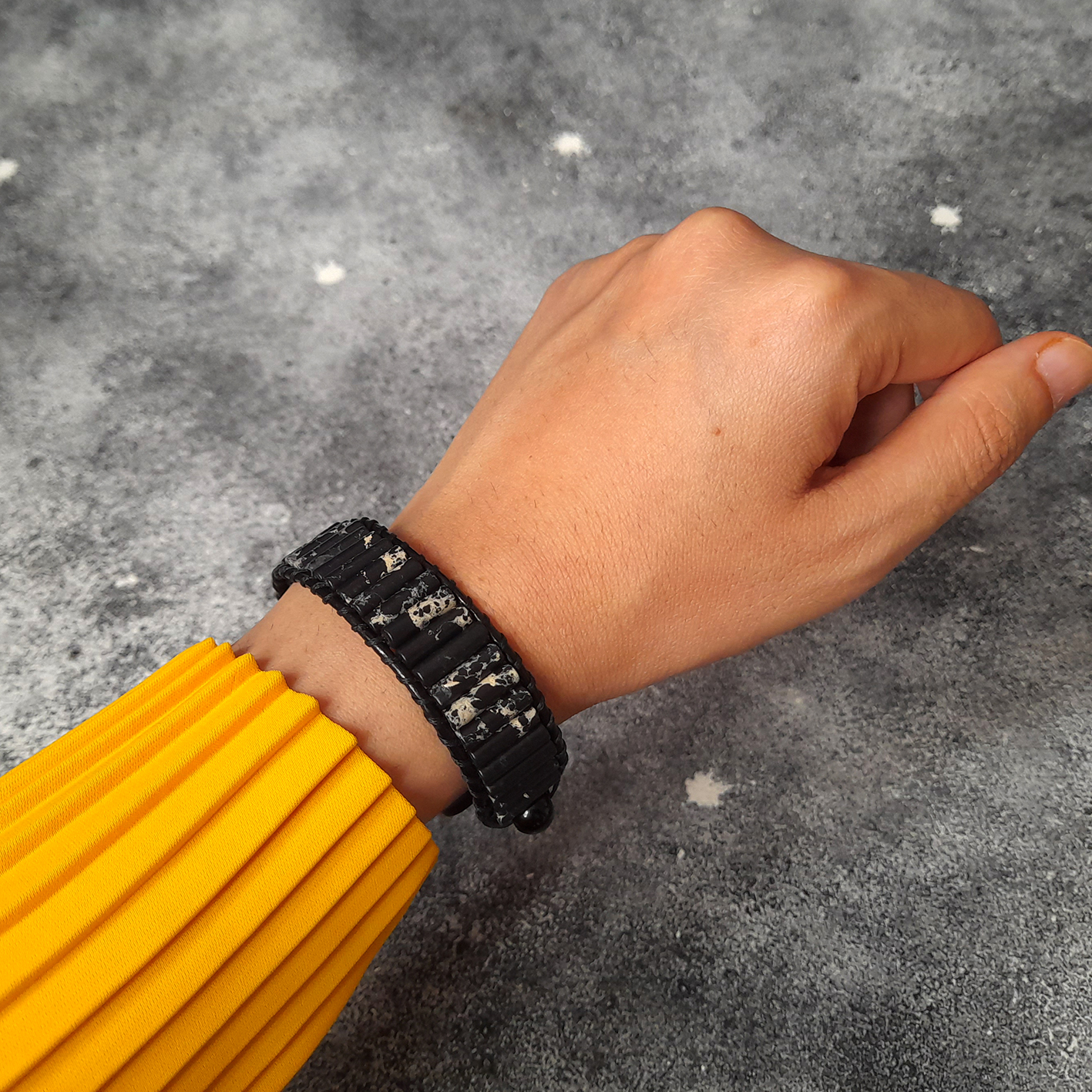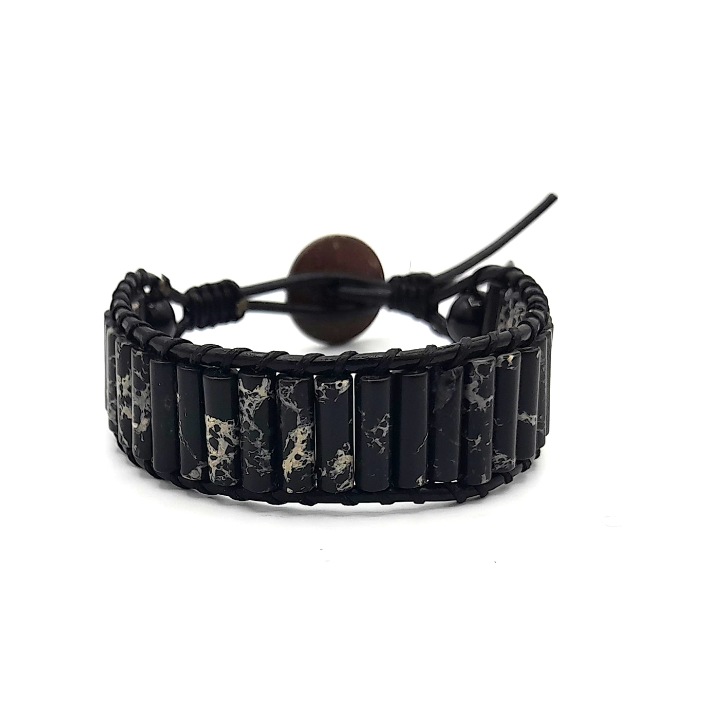 آبسیدین لکه برفی یک سنگ آتشفشانی است که از آن در ساخت دستبند سنگ آبسیدین لکه برفی کد 101 استفاده شده است که یک دستبند سنگی مردانه است. لکه های سفید رنگ موجود در این سنگ همان مواد معدنی کریستوبالیت هستند. تحریک قوه ی خلاقیت ، بهبود آرتروز ، تسکین درد، دفع اشعه های منفی چشم ، بهبود هضم ، رفع استرس و اضطراب ، ایجاد تعادل و هماهنگی در چاکرای اول، افزایش حس مثبت اندیشی و ایجاد عاطفه ی درونی ، کمک به ترک عادات منفی ، حفاظت در مقابل هجوم امواج منفی محیطی و … نمونه هایی از خواص سنگ آبسیدین لکه برفی کار شده در این دستبند زیبا می باشد.