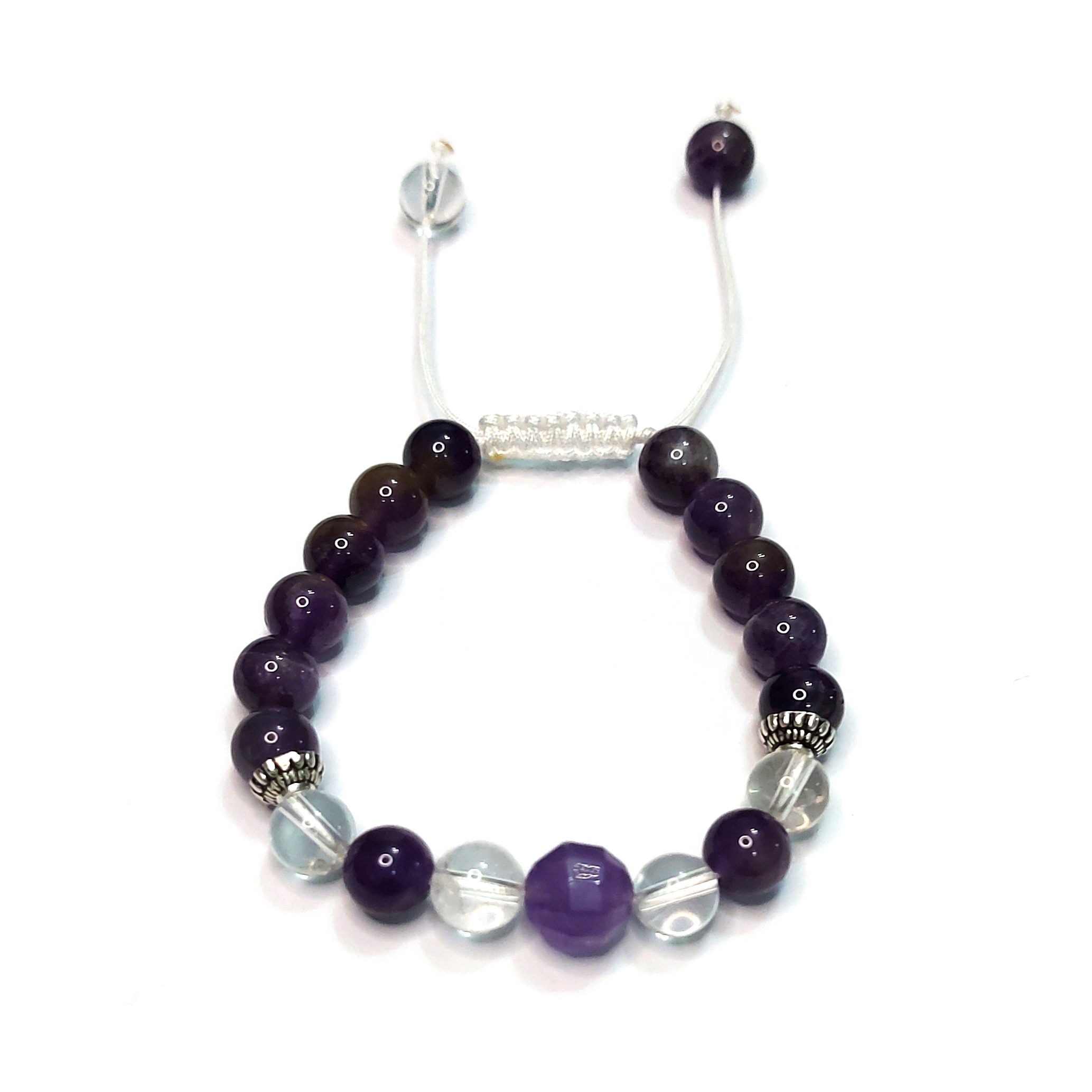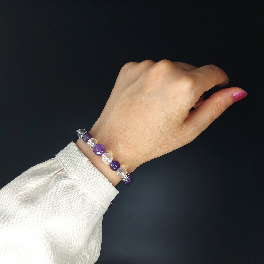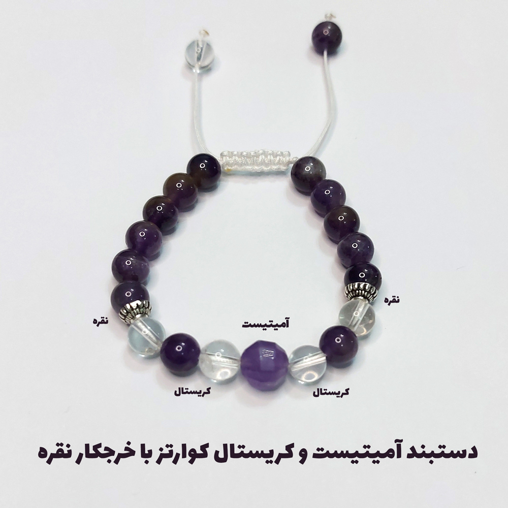 آمیتیست بهواسطۀ زیبایی بینظیر و خواص حیرتانگیز خود یکی از پرطرفدارترین سنگها به حساب میآید. دستبند سنگی کد 32 از ترکیب مُهرههای سنگ آمیتیست و کریستال کوارتز در کنار دو خرجکار از جنس نقرۀ باکیفیت و اصیل ساخته شده است. دانههای کریستال کوارتز در این دستبند با جادوی انرژی خود تأثیر آمیتیست را دوچندان میکنند. البته فراموش نکنید که کریستال کوارتز را باید هر چند وقت یکبار زیر نور مهتاب یا در آب شارژ کنید.