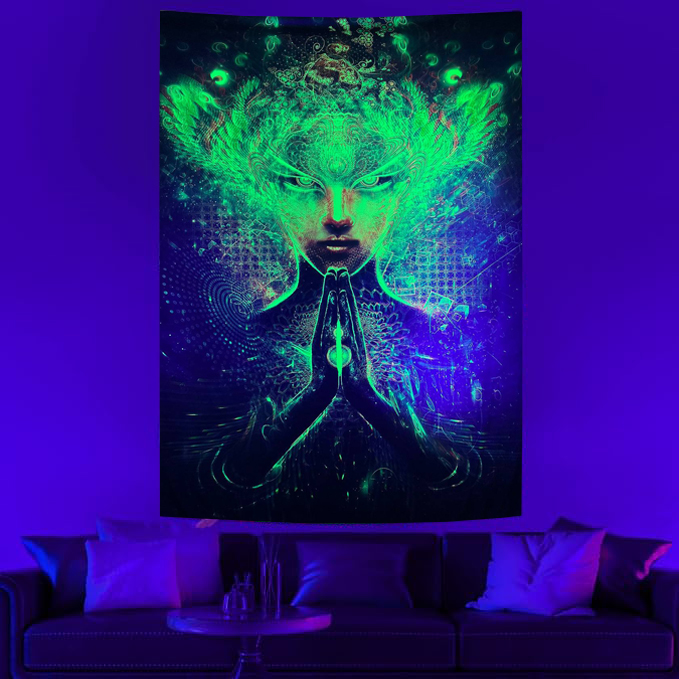 ابعاد این دیوارپوش 180 در 220 است که میتواند به راحتی در وسط یک دیوار بزرگ نصب شود. طرح هایی که در طراحی بکدراپ بلک لایت استفاده میشود معمولا طرح های هندی، بودایی و فرازمینی است. این طرح ها با رنگ های قالب آبی و فسفری روی پارچه کشیده میشوند و زیر نور ال ای دی بلک لایت جلوه بسیار منحصر به فردی دارند.