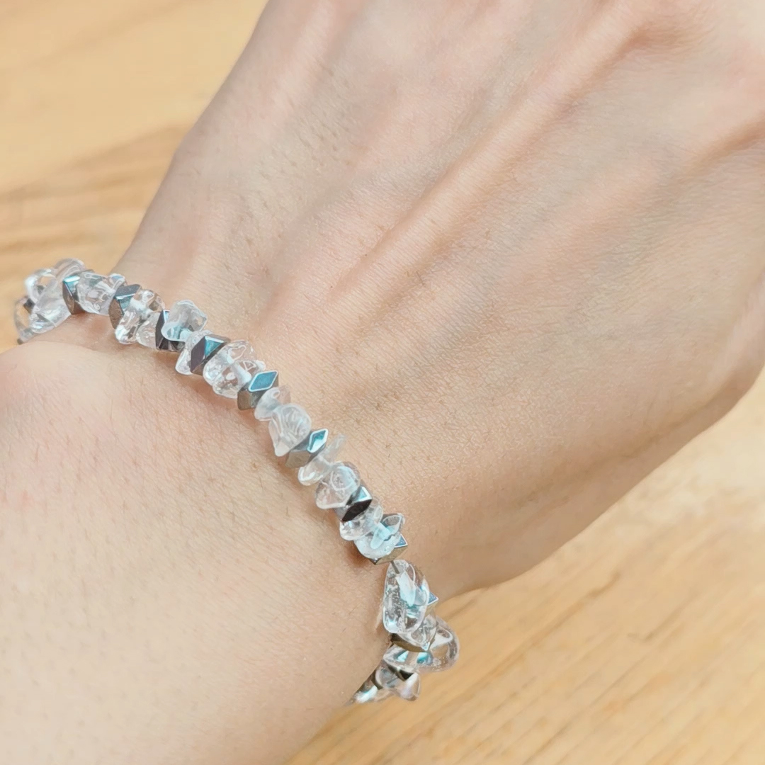 دستبند کوارتز چیپسی و حدید واشری کد 310264 از فروشگاه ناماسته، تلفیقی هنرمندانه از زیبایی‌های طبیعی و خواص انرژی‌بخش سنگ‌هاست. این دستبند منحصربه‌فرد، با چینش ظریف تکه‌های کوارتز چیپسی شفاف و براق، در کنار دانه‌های حدید واشری صیقلی و متالیک، جلوه‌ای خاص و مدرن به استایل شما می‌بخشد.