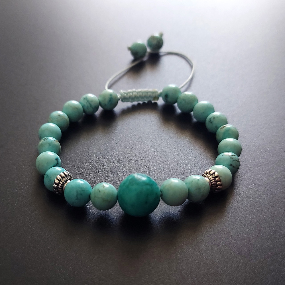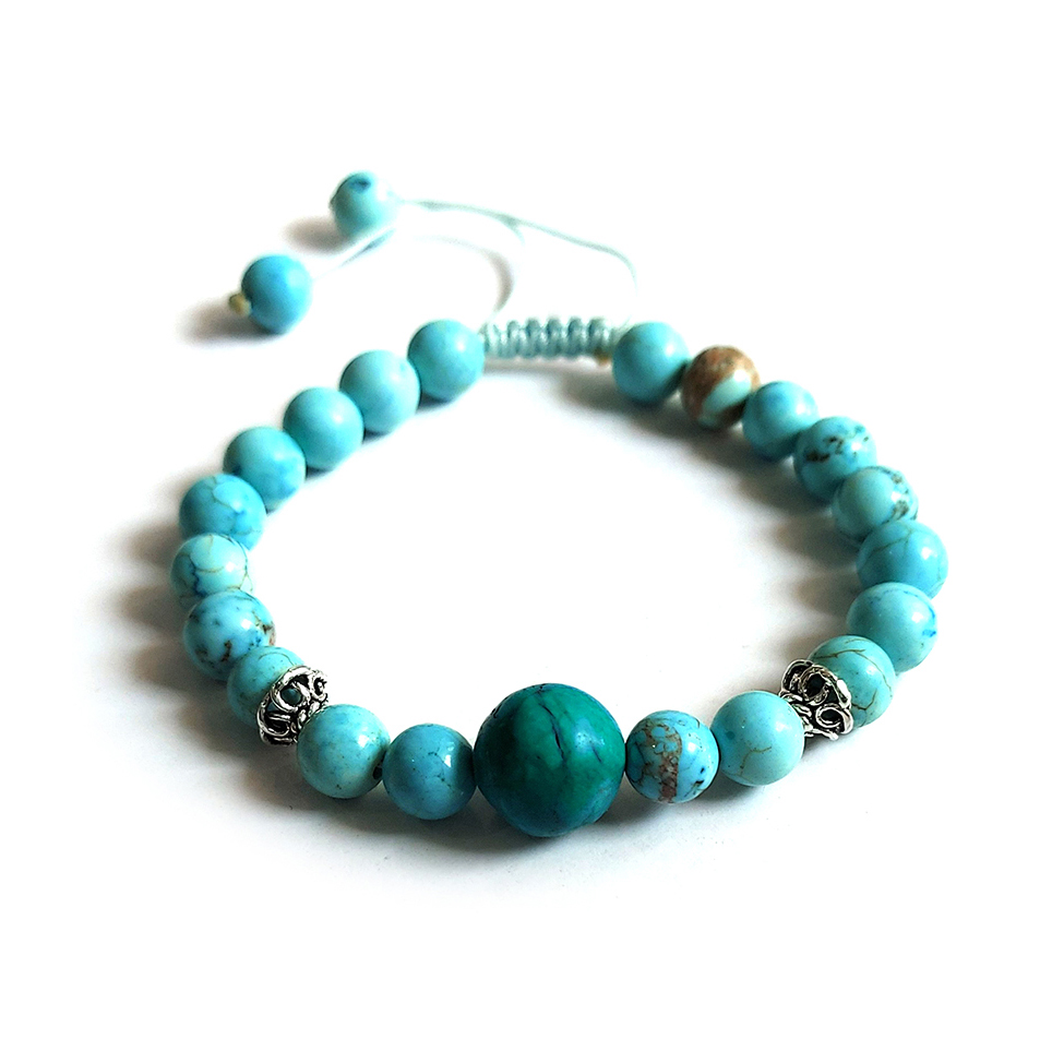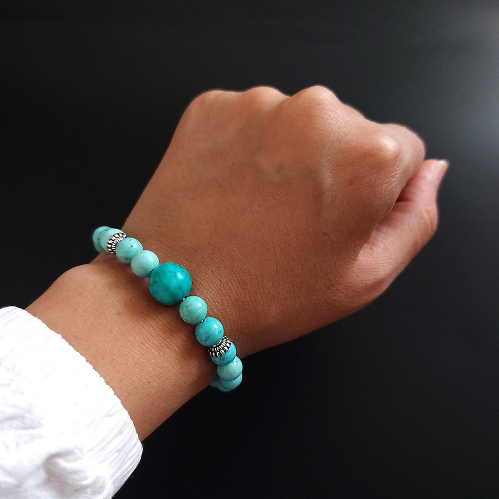 سنگ فیروزه از دیرباز تا به امروز بهخاطر زیبایی چشمنواز و خواص شگفتانگیز خود در میان همگان محبوب بوده است. دستبند سنگی کد 09 ترکیبیست ساده امّا خاص از دانههای فیروزۀ مصری و خرجکار نقرۀ اصل که با چیدمان رنگی کمنظیر خود چشم مینیمالپسندها را به خود خیره میکند.