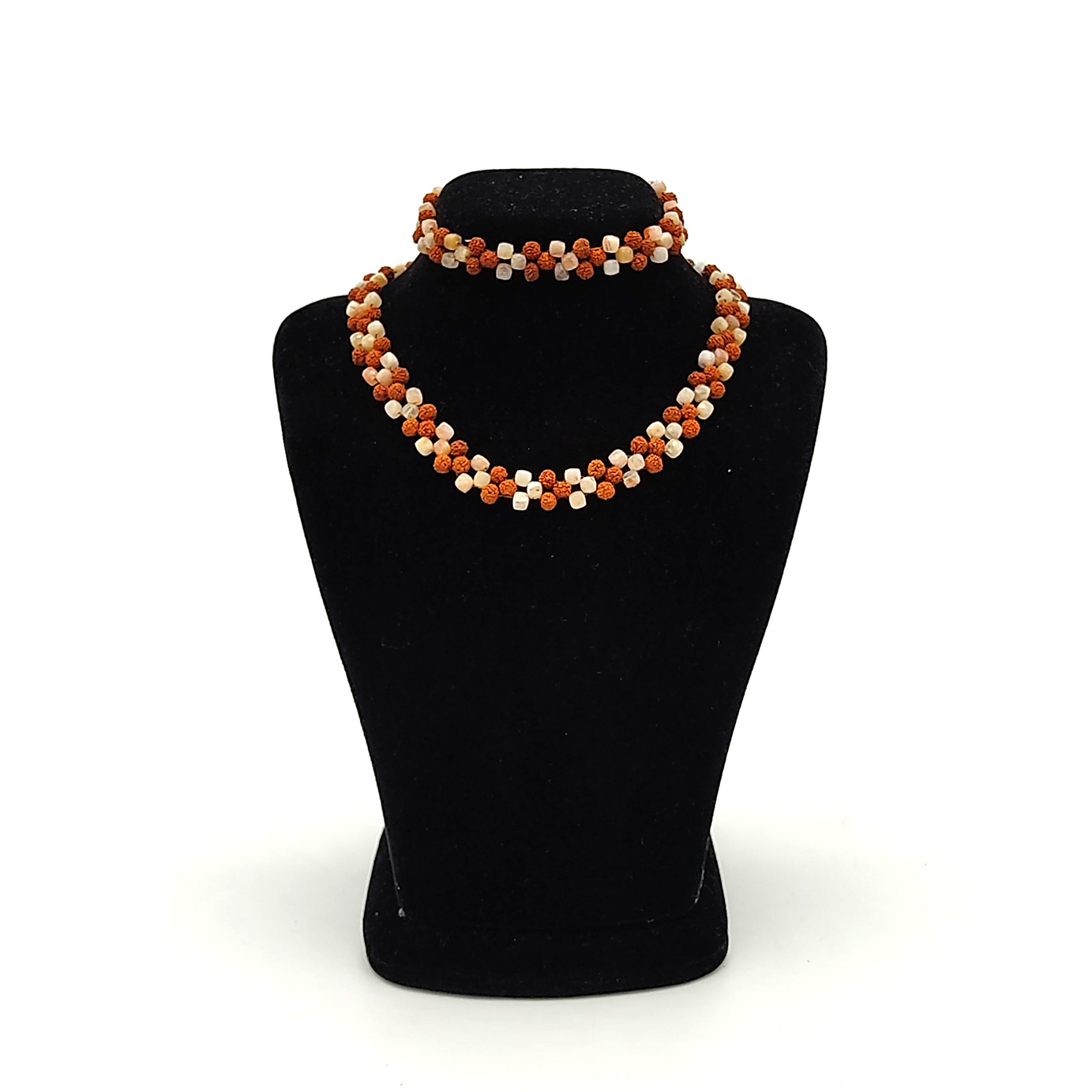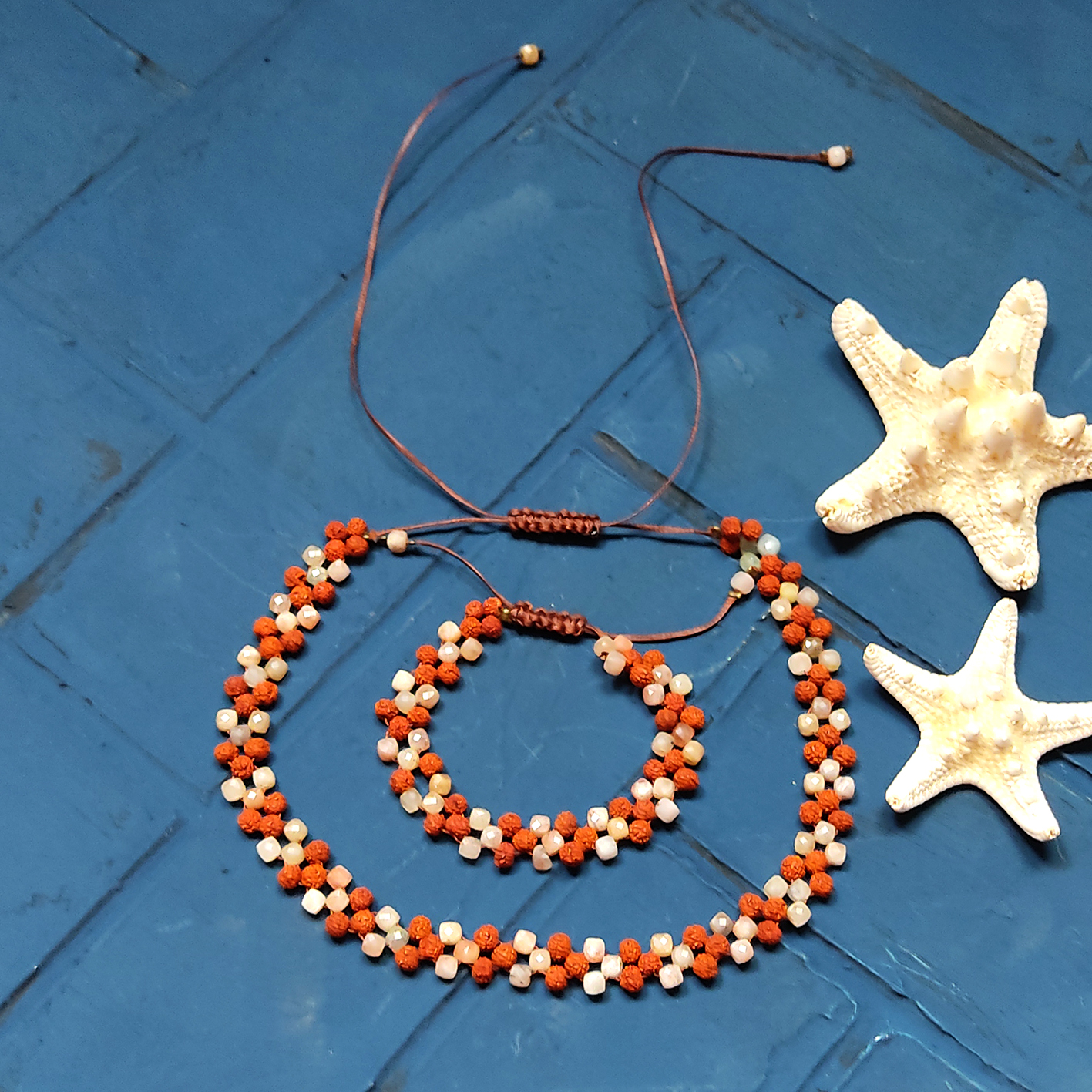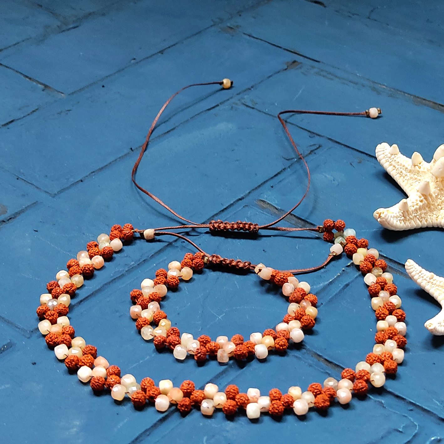 ست دستبند سنگی و گردنبند سنگ سان استون و رودراکشا کد36 از زیباترین ست های موجود در ویترین ناماسته است که از دانه های رودراکشا و سنگ های سان استون در ساخت آن استفاده شده است. در کنار خواصی که رودراکشا مالا برای آرامش بخشی به فرد دارد، سنگ سان استون دارای تاثیرات زیادی برای شادی و بهبود خلق و خو بوده و می تواند در جذب نیرو و ثروت های کائنات برای فرد اثر گذار باشد. از این ست زیبا برای بهبود چاکراها و کسب انرژی مثبت از طبیعت می توانید استفاده کنید.