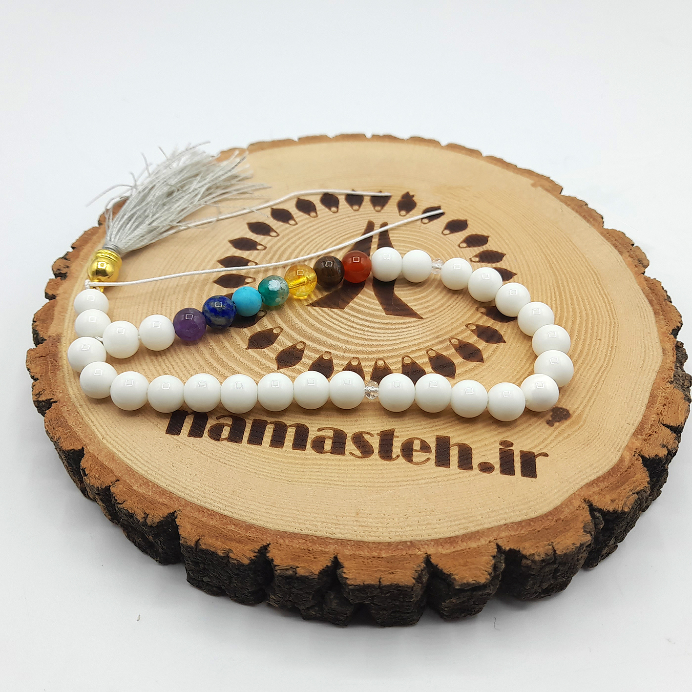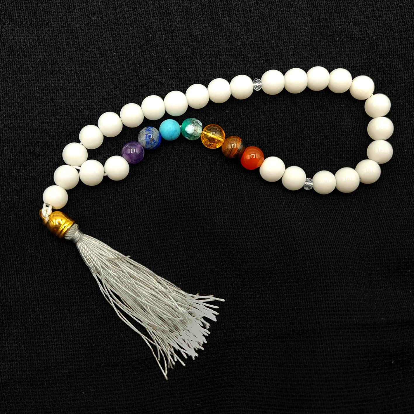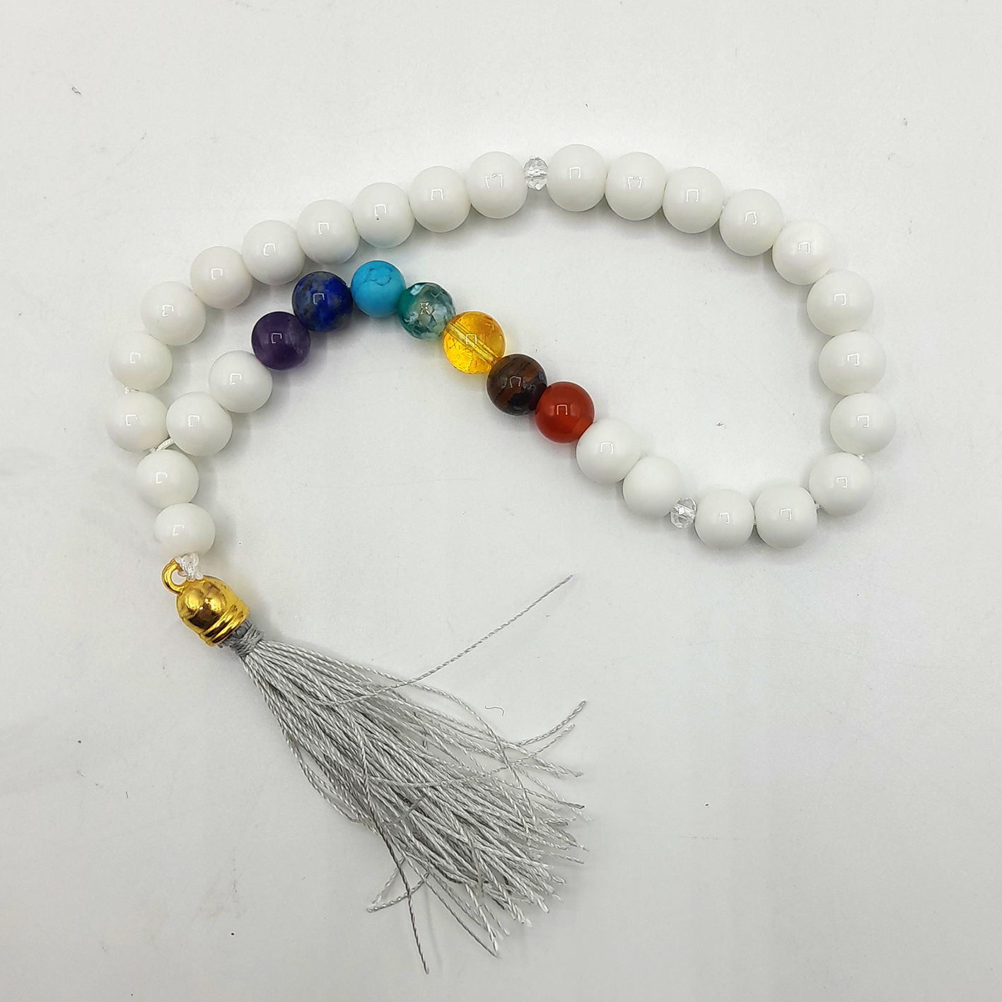 تسبیح هفت چاکرا که بخش عمده آن را مهره های اونیکس تشکیل داده است، برای ایجاد انرژی مثبت در بدن اثری بسیار قوی دارد. سنگ های رنگی که در این تسبیح هستند، هر کدام برای رفع مسدودی یکی از چاکراهای اصلی هستند. این سنگ ها چاکراها را پاکسازی می کنند و انرژی مثبت هم از طریق دانه های اونیکس در شاهراه های انرژی جریان می یابند. بدین صورت فرد اثر آن را به مرور در زندگی خود می بیند و متوجه آرامش خود می شود. به همراه داشتن این تسبیح برای افرادی که زندگی پرتنشی دارند، توصیه می شود. دانه های سفید اونیکس و زیبایی سنگ های هفت چاکرا در کنار هم از نظر ظاهری نیز جلوه زیبایی به این تسبیح خاص داده اند.