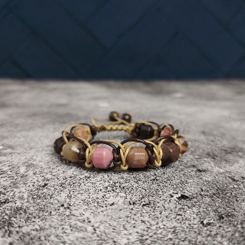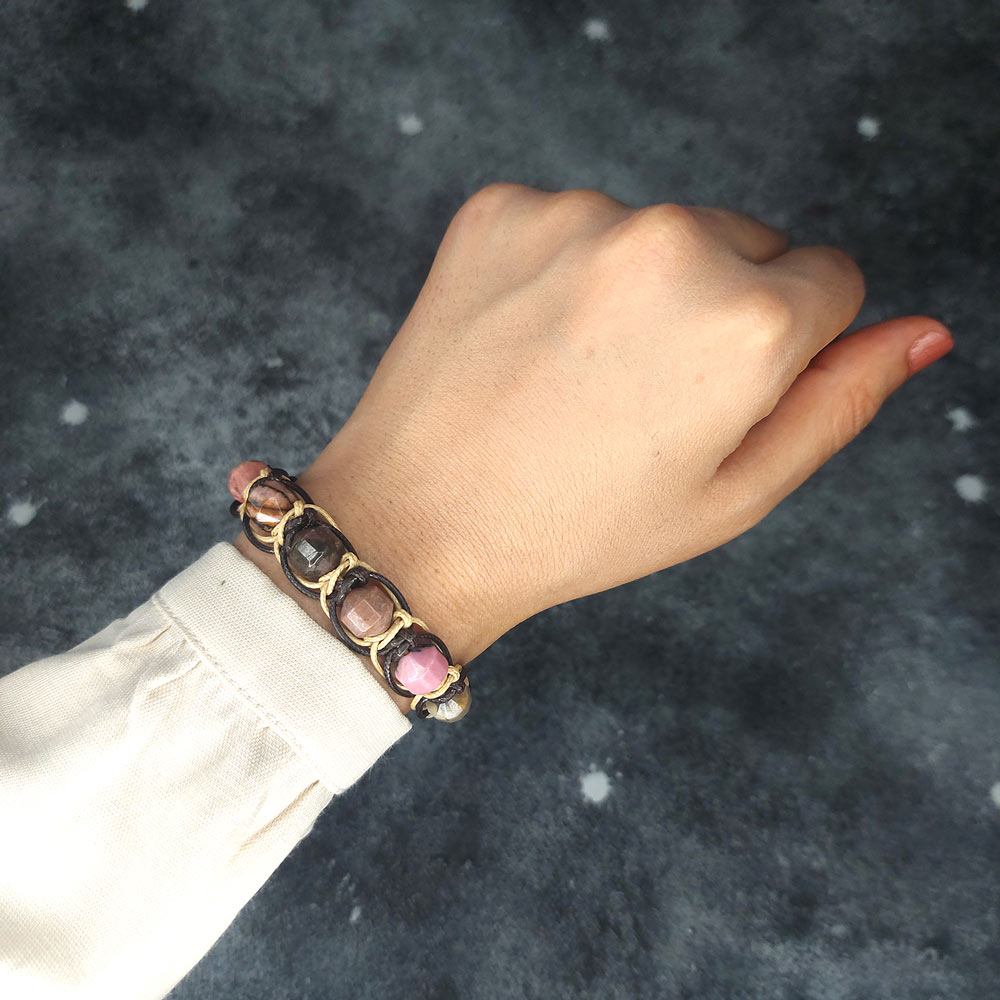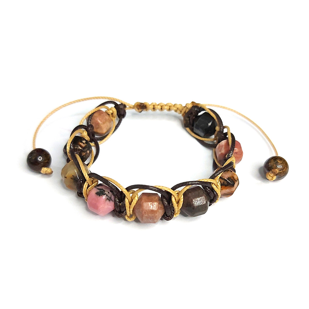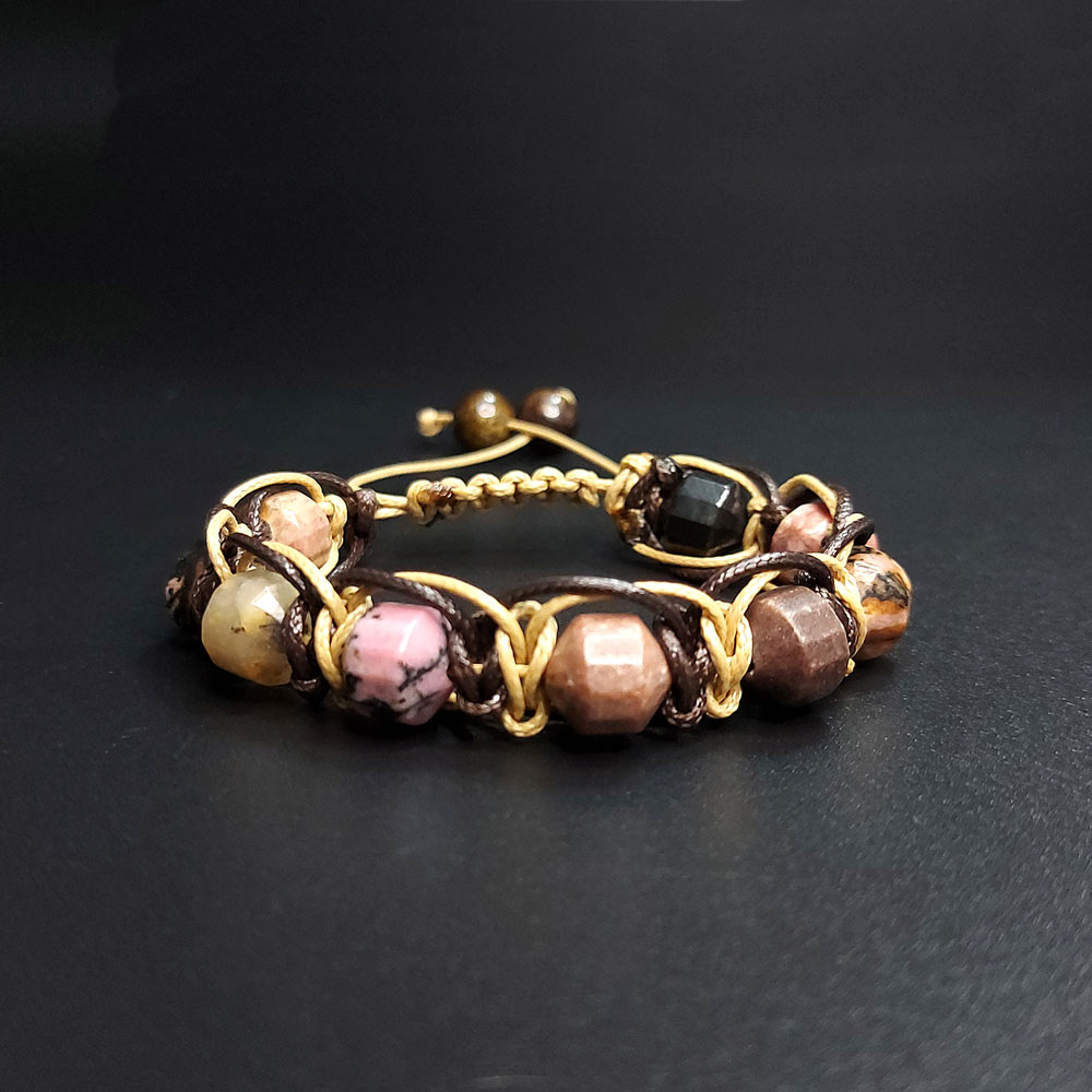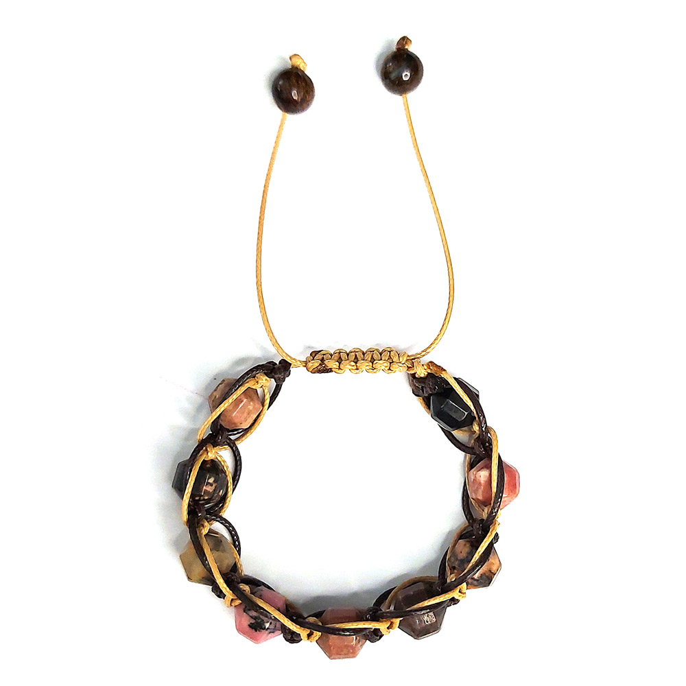 دستبند رودونیت یکی از زیباترین محصولات موجود وبسایت ناماسته است که طرفداران بسیاری دارد. این دستبند دارای بافت چرمی میباشد که به آن اصالت خاصی بخشیده است. سنگ های رودونیت این دستبند در رنگ های صورتی، قهوه ای روشن و قهوه ای سوخته هستند که خواص شفابخشی بسیاری دارند. بند این دستبند قابل تنظیم است و میتوانید برای دست های درشت و ظریف از آن استفاده کنید. بندهای چرم این دستبند در رنگ طلایی و مشکی است که با سنگ های داخل این بند هارمونی و تناسب دارد.