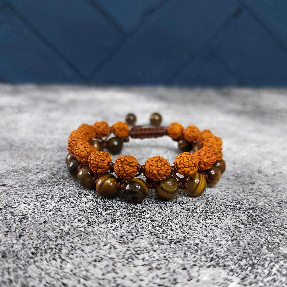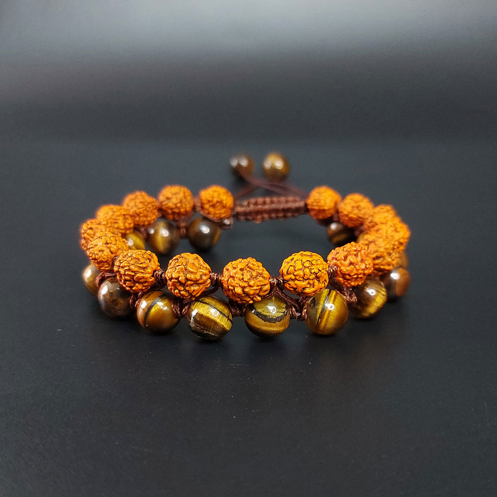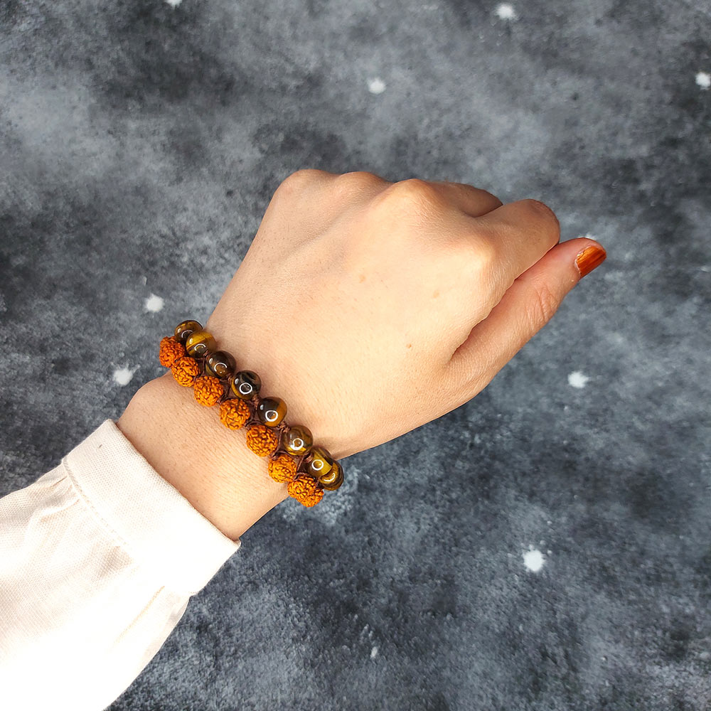 این دستبند از سنگ چشم ببر و دانه خشک شده رودراکشا مالا ساخته شده است که هر کدام از آنها خواص بسیار زیادی برای سلامتی روح و جسم شما دارند. سنگ چشم ببر به رنگ زیتونی و نارنجی و دانه رودراکشا به رنگ نارنجی است که یک ترکیب رنگ بسیار زیبایی را در کنار هم تشکیل داده اند. این دستبند بند قابل تنظیم دارد و حتی کسانی که دستان درشتی دارند میتوانند دستبند را در داخل دست خود بکنند. اما خواص استفاده از این دستبند زیبا چیست؟