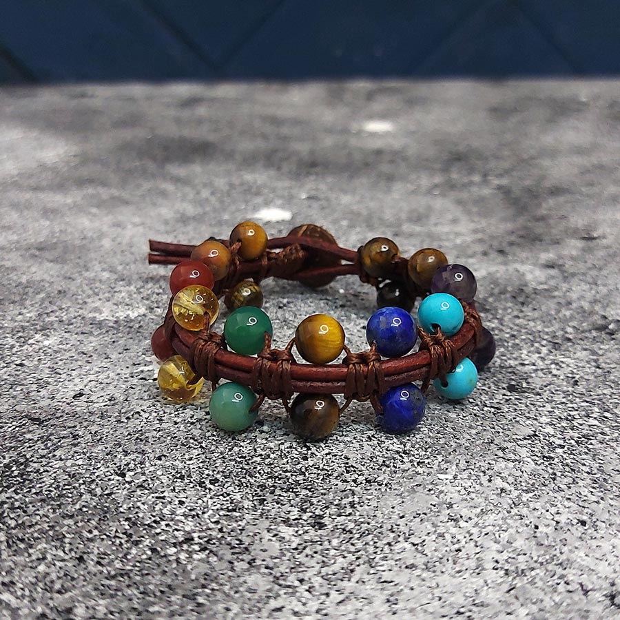 دستبند هفت چاکرا النگویی دو ردیفه یکی از بهترین صنایع دستی و ساخته دست هنرمندان می باشد. در ساخت و طراحی این دستبندها تلاش شده تا کیفیت و زیبایی به طور هم زمان مد نظر باشند. بنابراین از مروارید های رنگی و باکیفیت که رنگ و زیبایی آنها ثابت است در ساختار این دستبند استفاده گشته است.