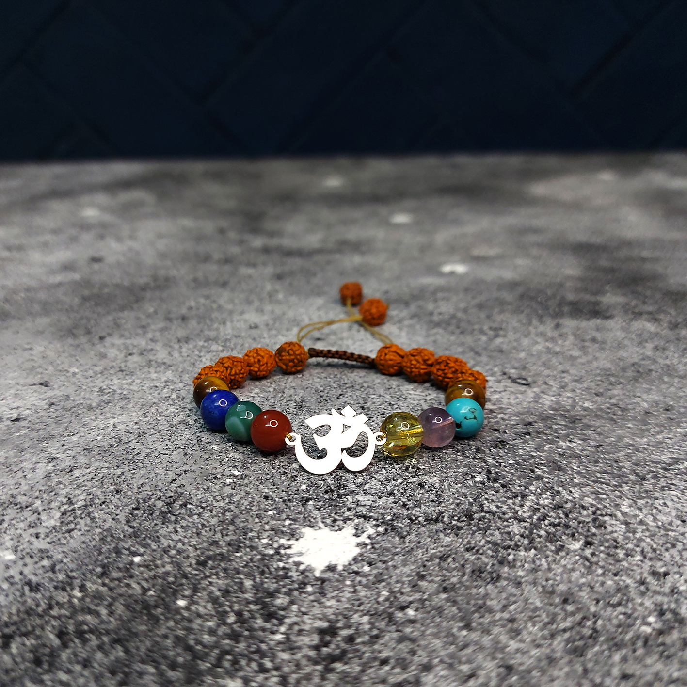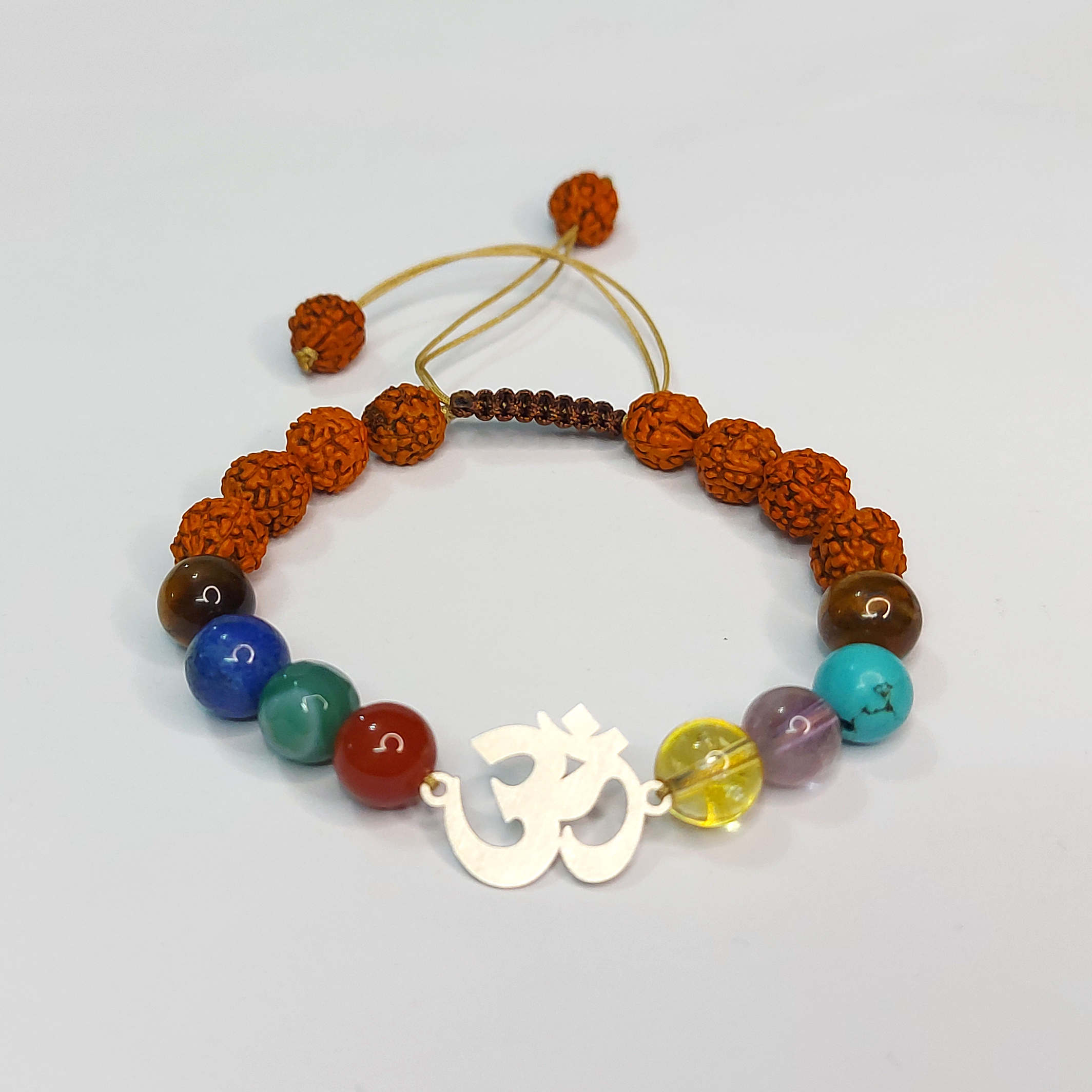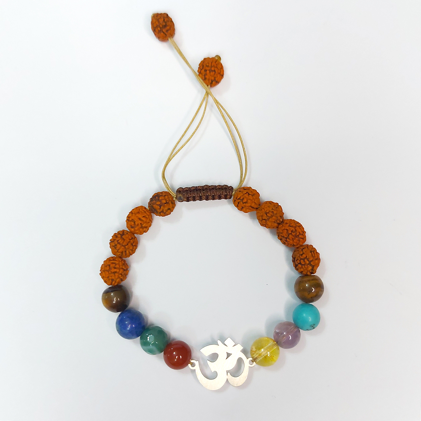 دستبند هفت چاکرا و رودراکشا با پلاک نقره اوم کد 81 یک دستبند با ظرافت و زیبایی خاص برای هدیه دادن است. در این دستبند علاوه بر سنگ هفت چاکرا از رودراکشا یا همان مالا نیز استفاده شده است. رودراکشا مالا سنگی با منشا گیاهی است که از درخت مقدس هندیان استخراج می شود. این دستبند سنگی دارای پلاک نقره اوم در قسمت میانی است که جذابیت دستبند را افزایش داده است. سنگ های هفت چاکرا که در این دستبند استفاده شده اند به شرح زیر می باشند:
